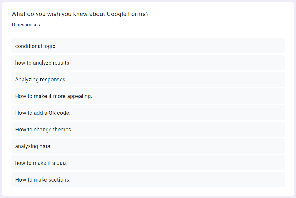 So that’s how you can analyze a Google Forms response summary page. It’s pretty easy and visual. Further, Google Forms automatically picks the correct format to depict responses in an easily understandable manner.