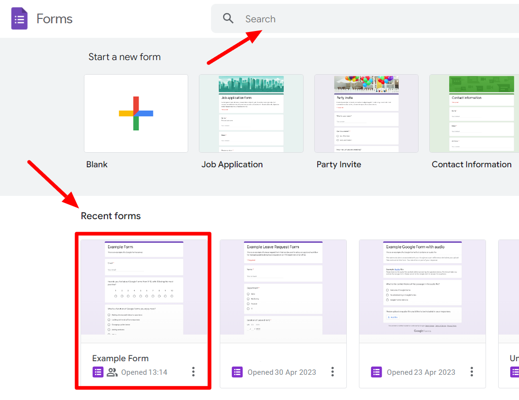 Navigate to your Google Forms. Once at the homepage, select the form you want to analyze under the recent forms section. If you don’t find your form there, you can also use the search field to enter the form's name and search for it directly.