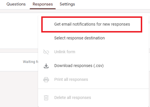 The first option in the drop-down menu is "Get email notifications for new responses." This is the option you want to select so that you will be notified by email whenever someone RSVPs to your form.