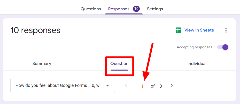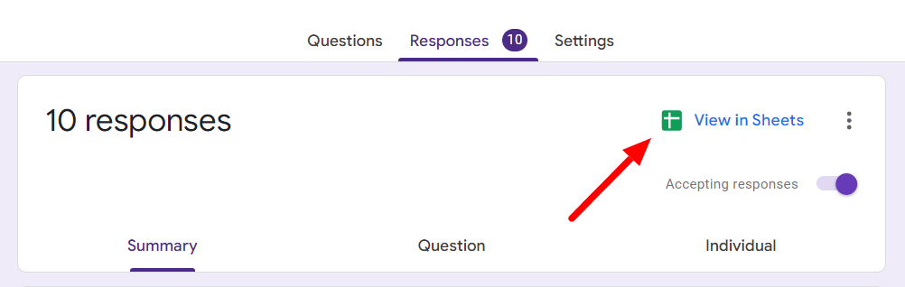 The most obvious way to view your form responses is to look at the Google Forms Responses tab. You have to be the owner or a collaborator to view Google Form responses in this manner.