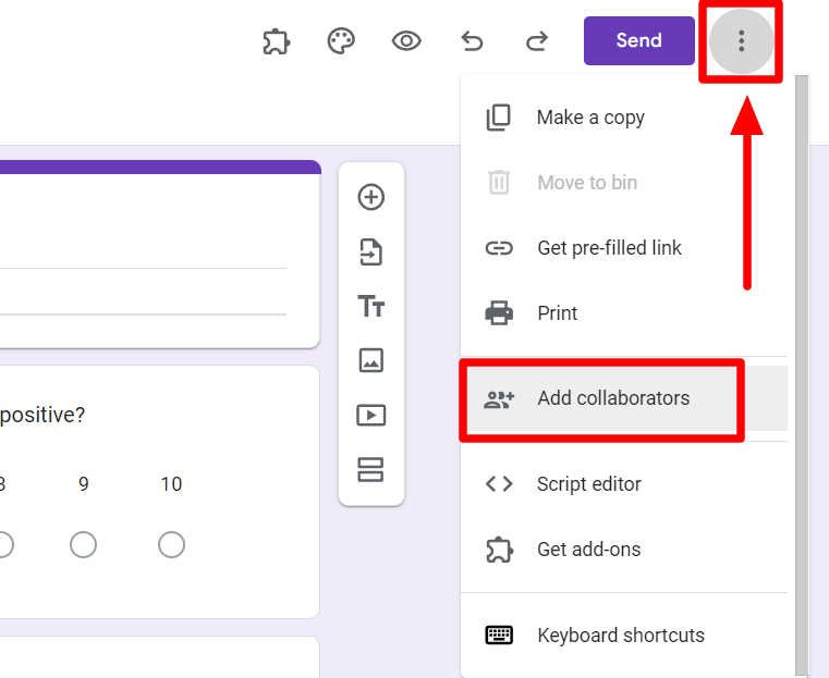 On your form, click the three dots in the top right corner. Then find and click “Add Collaborators.”