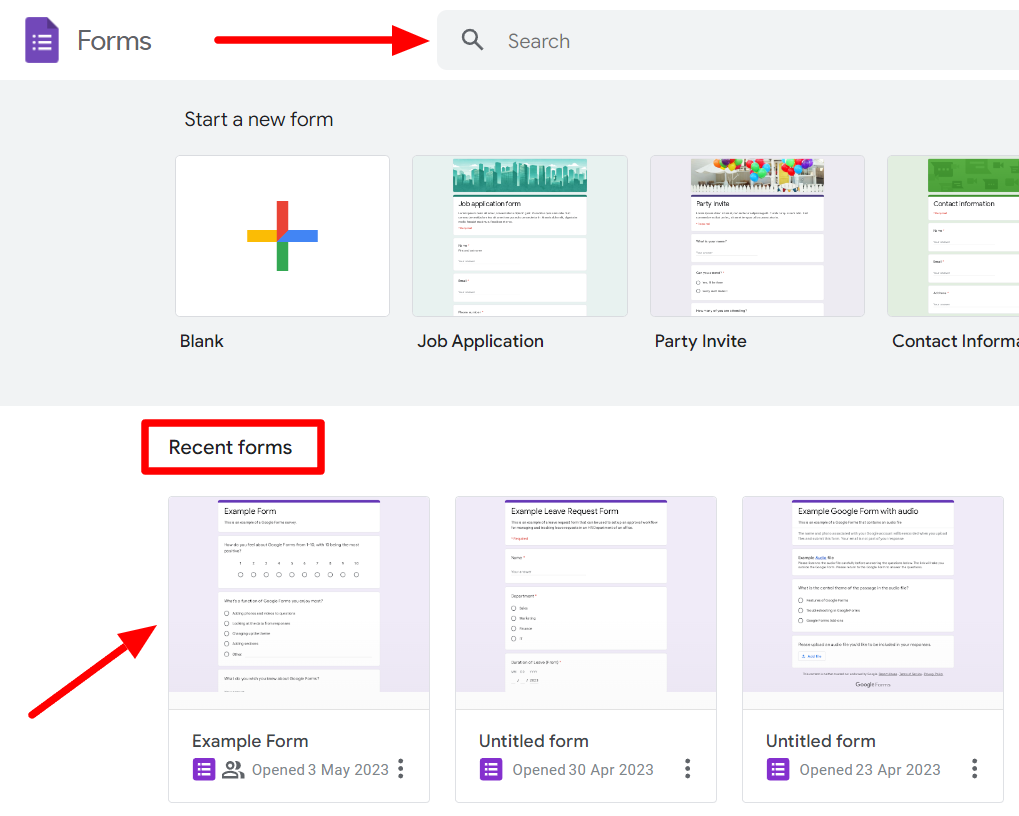 Navigate to your Google Forms. Open the form with responses you want to view from your “Recent Forms.” If you can’t find your form under Recent Forms, you can also type the form's name directly into the search field on the top.